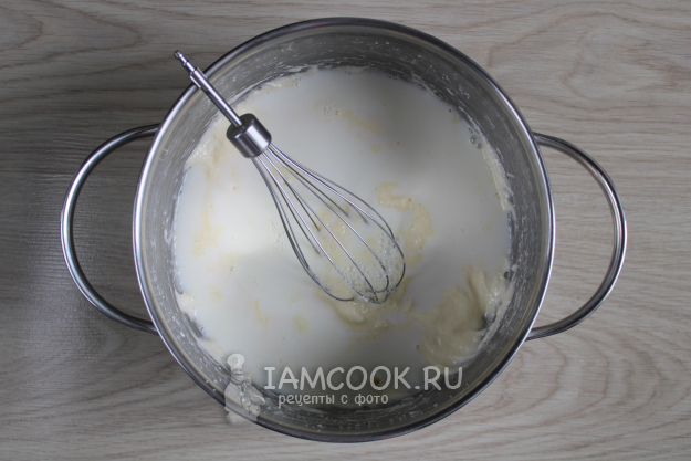 Соедините с мукой, разрыхлителем и щепоткой соли, перемешайте до однородного состояния.