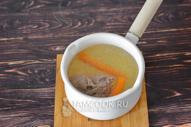 Залейте кусок говядины водой и доведите до кипения. Первые 5 минут тщательно снимайте всю пену. После чего убавьте огонь на минимум, добавьте соль и очищенную морковку и варите говядину до мягкости примерно 1,5-2 часа. Мясо должно стать мягким.