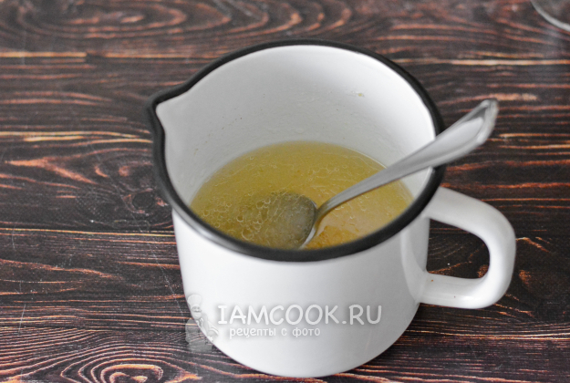 В остывшем до комнатной температуры бульоне замочите желатин на 20 минут и прогрейте его до полного растворения.