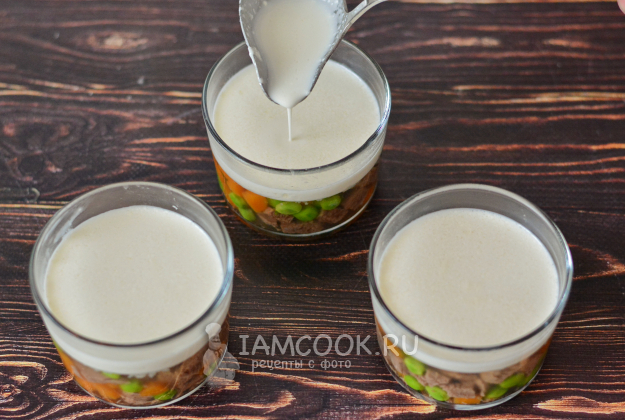 Аккуратно вылейте белую прослойку поверх застывшего заливного. И вновь поставьте в холодильник, чтобы белый слой застыл.