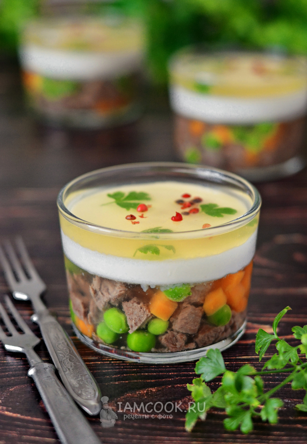 3алейте говядину с овощами бульоном, в котором вы растворили желатин, чтобы он едва-едва скрыл их, и уберите в холодильник для застывания.