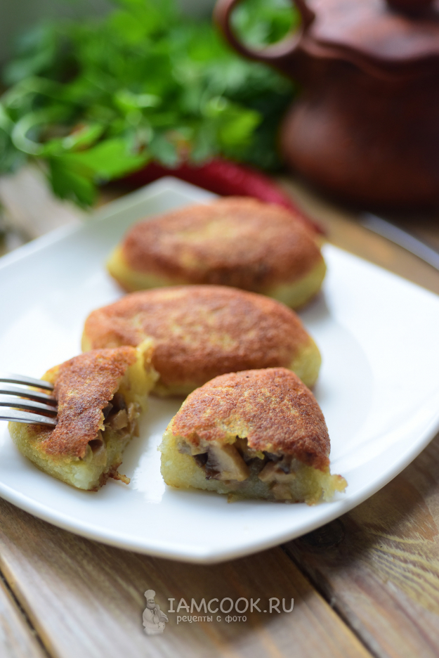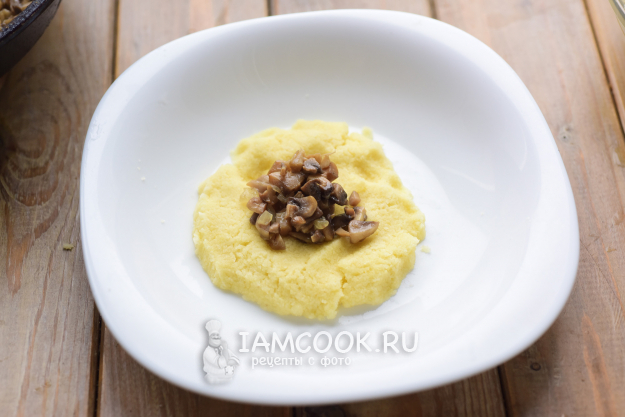 Часть картофельной массы расплющим в виде блинчика на ладони, выложим на центр грибную начинку, поднимем края картофельной массы.