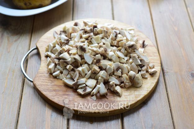 Шампиньоны нарежем маленькими кубиками.