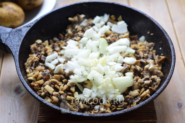 Добавим лук к шампиньонам, всыплем 1 ч.л. соли, черный молотый перец, выдавим через пресс чеснок и продолжим обжаривать всё вместе до мягкости лука.