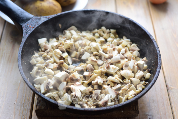 Обжарим в растительном масле на сковороде нарезанные шампиньоны до полного выпаривания жидкости.