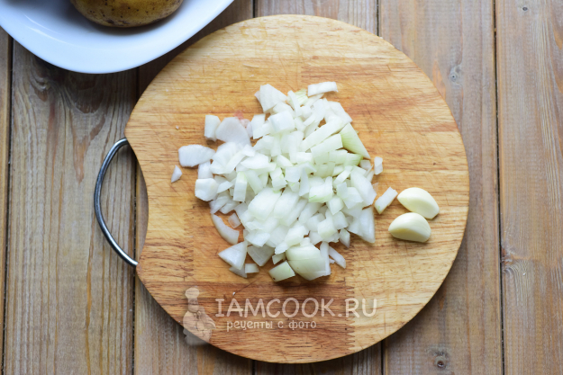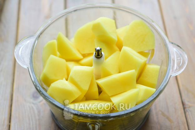 Картофель нарежем произвольными кусочками, выложим в чашу чоппера.