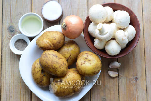 Картофель почистим и помоем. Почистим лук и чеснок. Помоем шампиньоны.