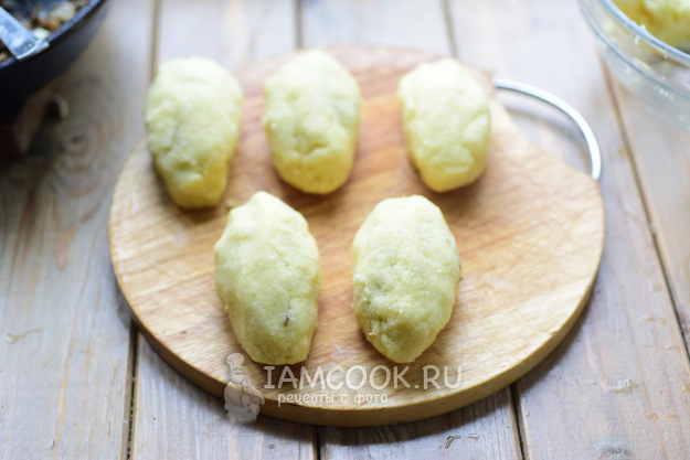И сформируем заготовку колдуна так, чтобы грибная начинка была полностью покрыта слоем картофельной массы.
