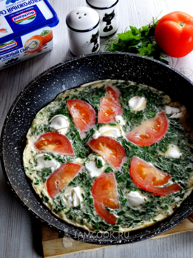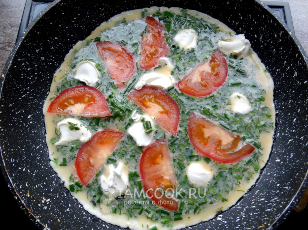 Накрыть крышкой и готовить омлет с помидорами и зеленью на сковороде на среднем огне до устойчивого верха.