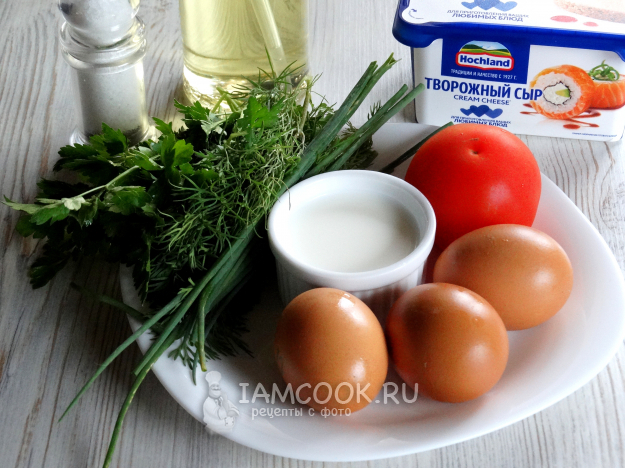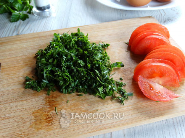 Зелень мелко нарубить, помидор нарезать полукольцами.