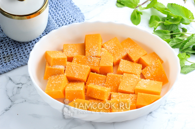 Очистите часть тыквы от кожуры и семян, промойте ее в воде. Нарежьте средними кубиками или ломтиками и выложите в форму для запекания. Сверху присыпьте ее ванильным сахаром. Тем, кто любит десерты послаще, рекомендую добавить и пару ложек сгущенного молока.