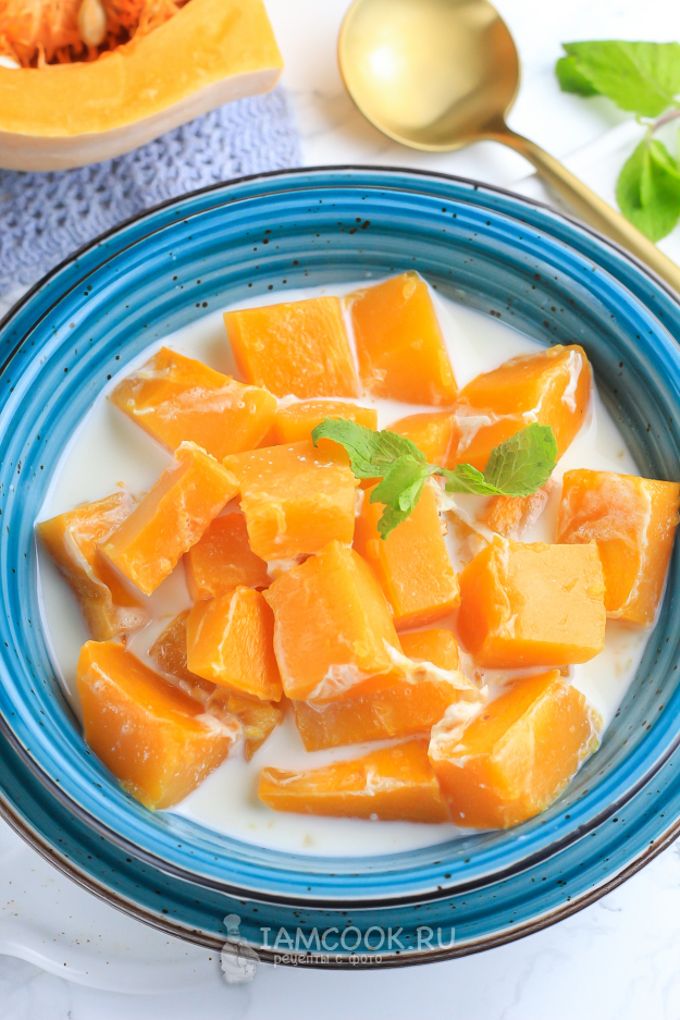 Выложите тыкву в молоке из духовки в тарелки и подайте к столу теплой.