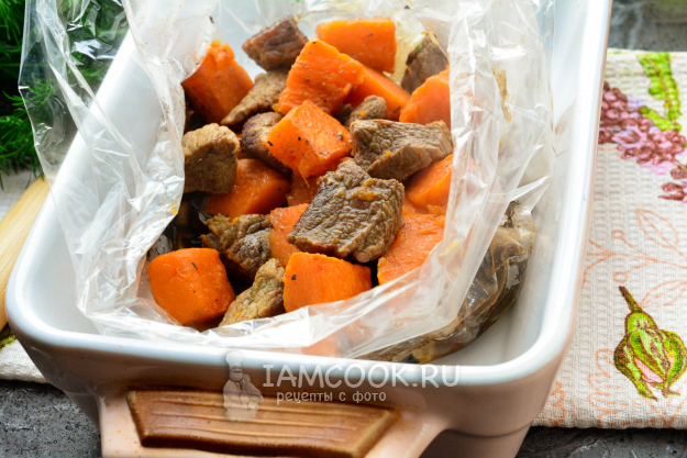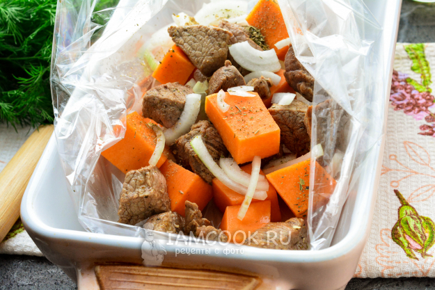 Сложите все ингредиенты в рукав для запекания, завязав его предварительно с одного края. Перемешайте тыкву с луком и жареным мясом. Тыкву и лук я также присыпала специями. Полейте мясо с овощами оливковым маслом, завяжите второй край рукава и отправьте все в духовку.