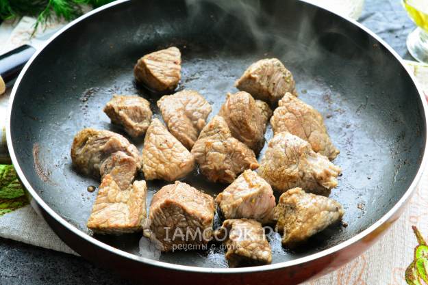 На сухой сковороде обжаривайте телятину 3-4 минуты, до румяной корочки. Мясо жарьте быстро.