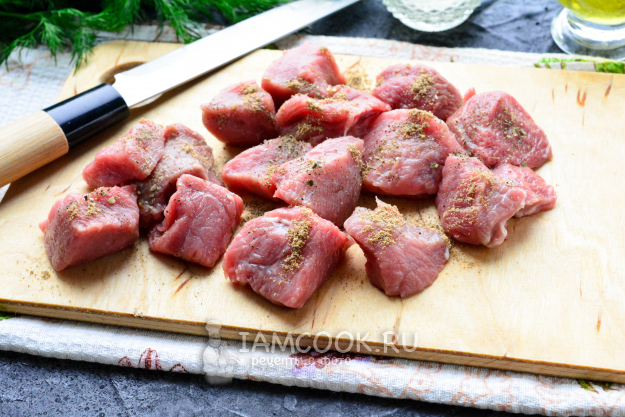 Телятину сполосните, вытрите бумажными полотенцами, нарежьте средними кусочками. Мясо посолите и поперчите, добавьте молотый кориандр и хмели-сунели для аромата.