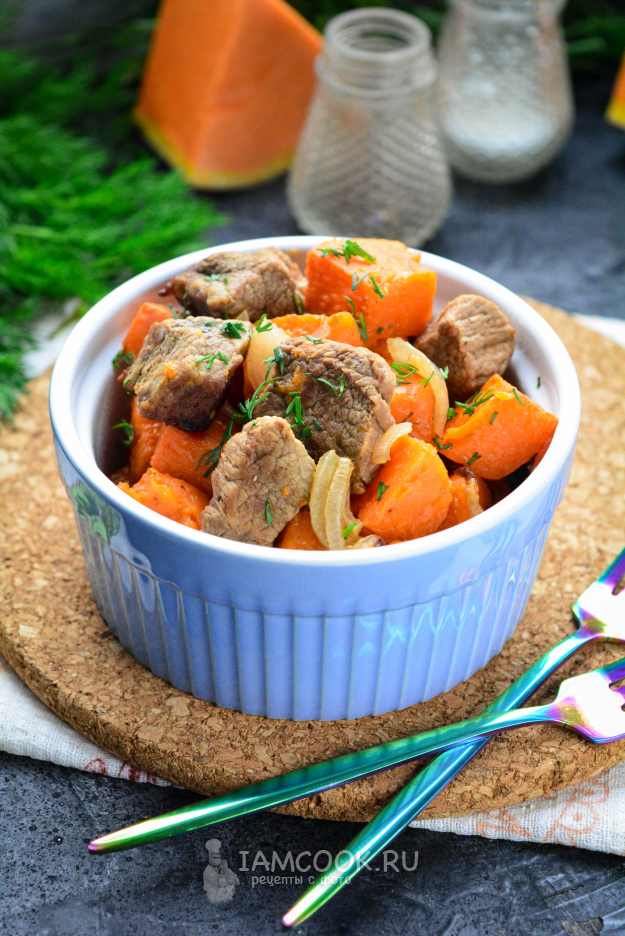 Горячую тыкву с мясом сразу подавайте к столу. Такой овощ, как тыква, идеально дополняет телятину, а в рукаве все готовится максимально просто и быстро. Приятного вам аппетита!