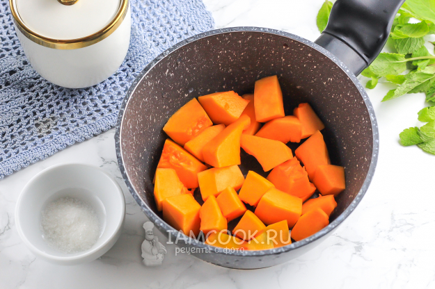 Тыкву очистите от семян, срежьте кожуру и промойте. Нарежьте мякоть средними ломтиками и выложите в кастрюлю, казан. Влейте кипяток и отварите тыкву до мягкости, примерно 10 минут.