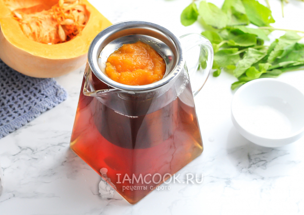 Выложите тыквенное пюре в ситечко и перемешайте. Накройте крышкой и оставьте на 10 минут. Тыквенное пюре отдаст чаю свой вкус и аромат, но он не станет мутным. Если же вы не против мутности напитка, то вмешайте тыквенное пюре прямо в заваренный чай без ситечка.