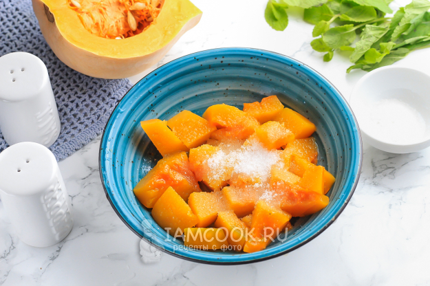 Тыкву выложите в глубокую емкость и присыпьте ванильным сахаром. Пюрируйте вилкой или толкушкой в пюре. Можно добавить и обычный сахар, если любите более сладкие напитки.