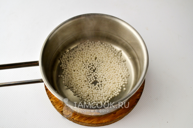 В кипящую воду всыпьте шарики тапиоки, перемешайте. После закипания варите шарики 15 минут на среднем огне.
