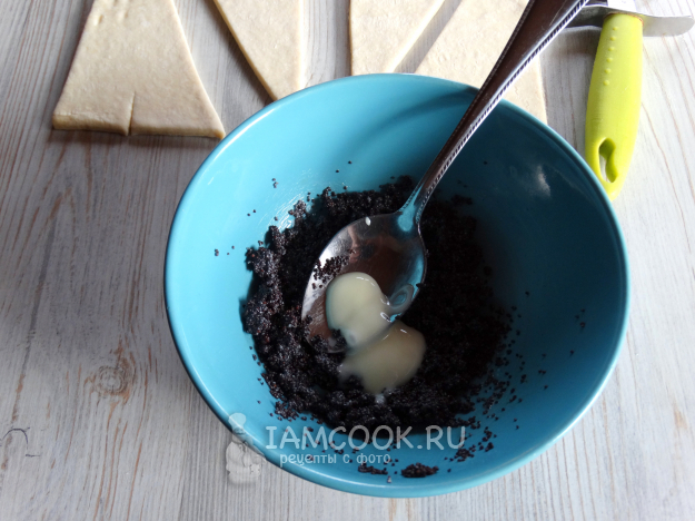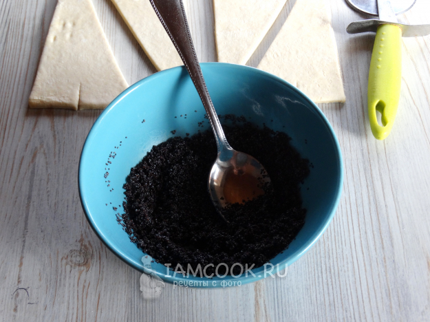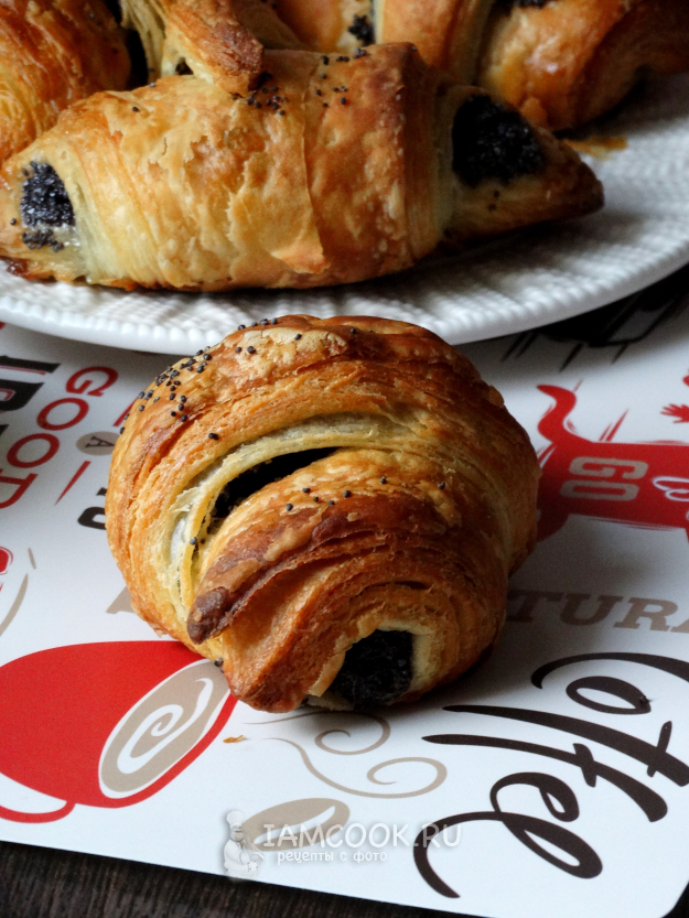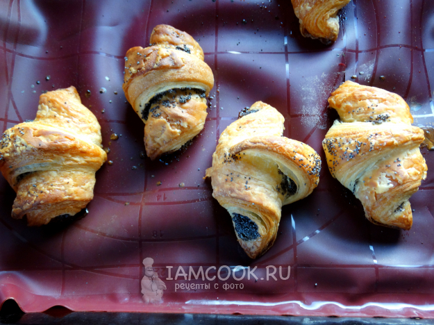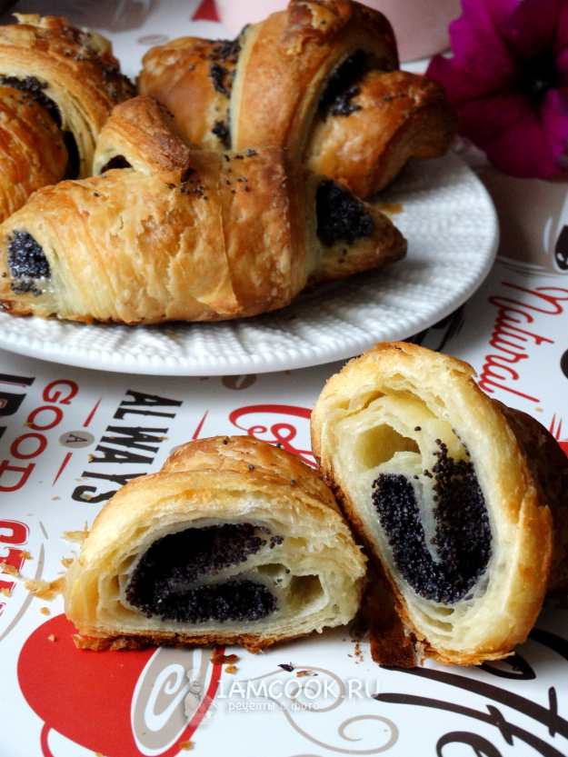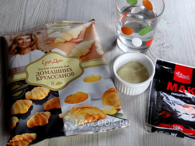 Круассаны с маком готовим из таких ингредиентов. Можно взять слоёное дрожжевое тесто или же использовать специальное тесто для круассанов. Если его поджарить, оно такое рассыпчатое и хрустящее, ммм!