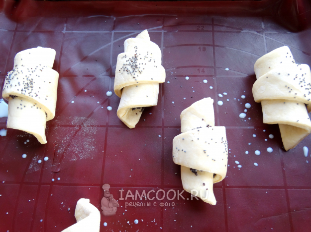 Накрыть круассаны полотенцем и оставить на 20 минут, затем смазать молоком и посыпать сухим маком (по желанию).