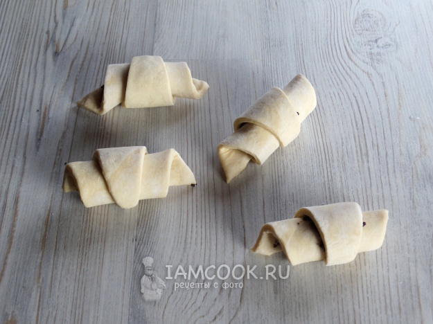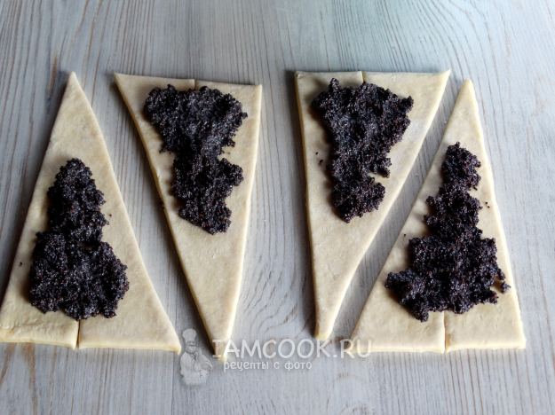 Размороженное тесто разрезать на 4 треугольника, посередине сделать небольшой надрез.