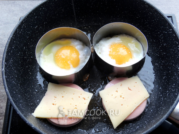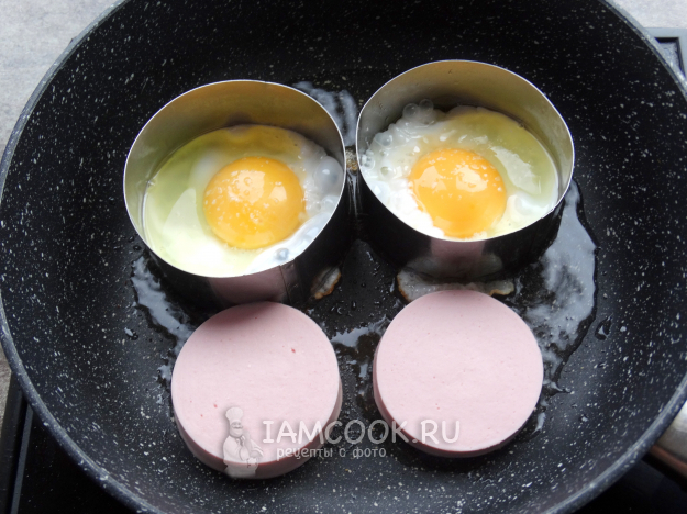 Яйца удобнее пожарить в кольце, но если его нет, жарьте традиционным способом, подсолив.