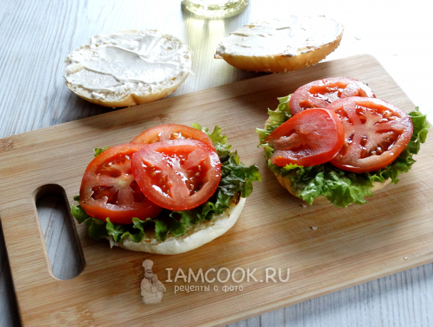 Нижнюю булочку "застелить" листьями салата и помидорами.