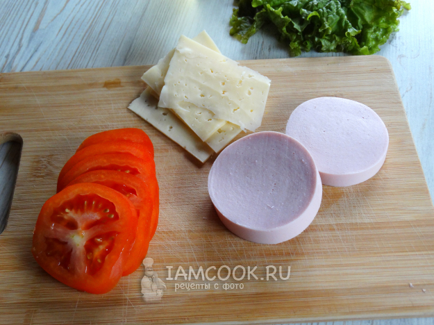 Помидоры, сыр и колбасу нарезать, как нравится.