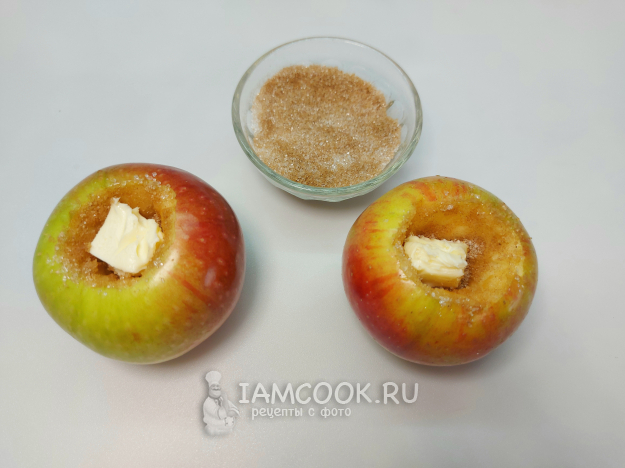 Стенки получившегося углубления посыпаю смесью из сахара и корицы, в центр кладу кусочек сливочного масла.