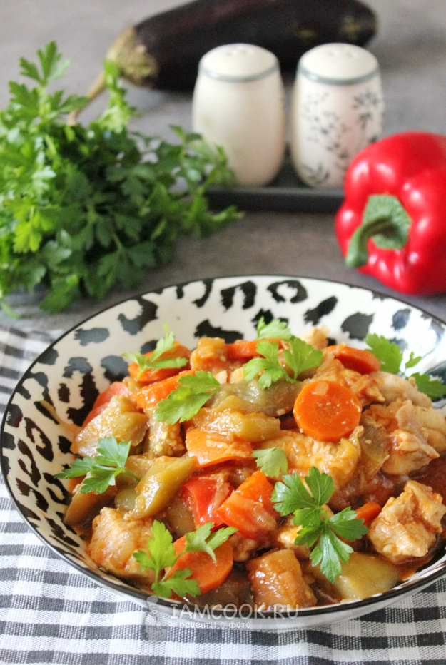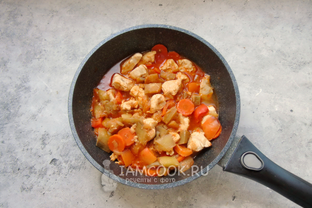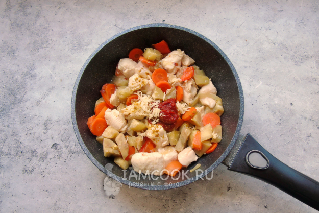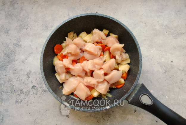 Куриное филе помойте и нарежьте произвольно. Добавьте к овощам. Тушите 5-6 минут под крышкой.