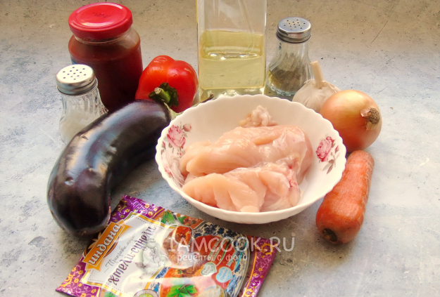 Соберите ингредиенты для приготовления баклажанов с мясом по-грузински.