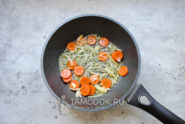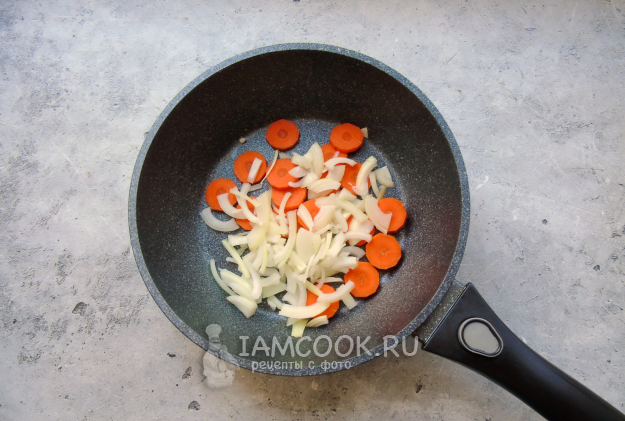 Морковь и лук очистите, помойте. Нарежьте произвольно и выложите в сковороду.