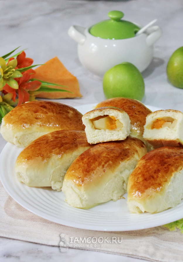 Пеките дрожжевые пирожки с тыквой и яблоками в духовке 30-35 минут. Время выпекания зависит от вашей духовки.