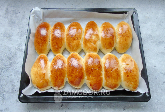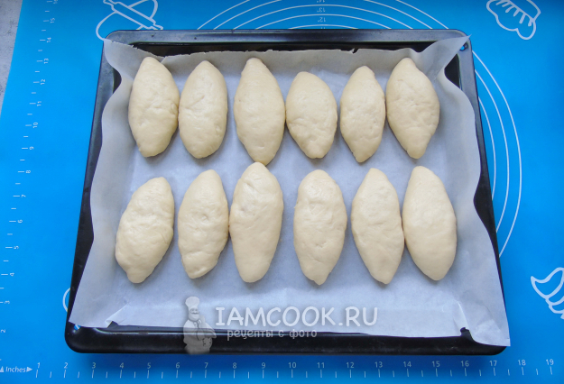 Выложите пирожки на противень швом вниз. Накройте пленкой и дайте постоять 20-25 минут. После смажьте яйцом и отправьте в духовку, разогретую до 175-180 градусов.