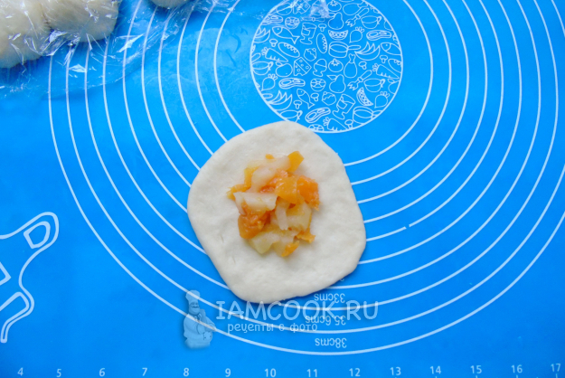 Каждый шарик раскатайте в лепешку, на середину которой выложите начинку из тыквы и яблок.