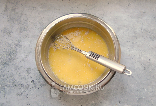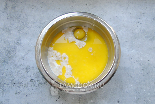 Сливочное масло или маргарин растопите, немного охладите, добавьте в миску, разбейте яйцо.