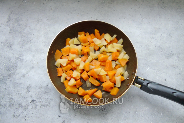 А пока тесто подходит, приготовьте начинку. Тыкву и яблоки очистите, помойте, нарежьте небольшими кубиками и выложите в сковороду. Налейте 2-3 столовые ложки воды, накройте сковороду крышкой и тушите до мягкости. Если яблоки очень кислые, то добавьте сахар.