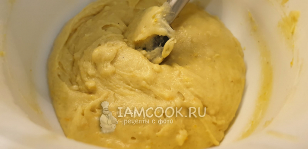 Яйца за час до приготовления достать из холодильника. В чаше миксера взбить яйца, ванильный сахар и сахарную пудру до пышной массы, добавить щепотку соли, продолжая взбивать. Отправить к яичной массе сок половины апельсина, 1 ч. л. цедры, растопленное сливочное масло, снова взбить на малой скорости.