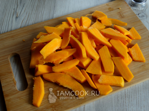 Очищенную тыкву нарезать нетолстыми пластинками.