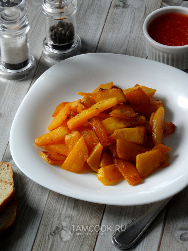 Лучше потряхивать сковороду, переворачивая кусочки - лопаткой можно превратить тыкву в пюре.