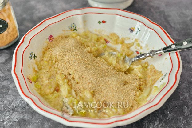 Добавьте панировочные сухари и ещё раз всё тщательно перемешайте.
