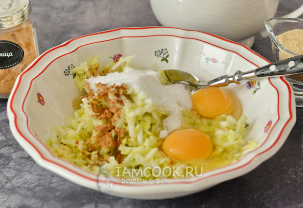 Яблоки натрите на крупной тёрке, добавьте сахар и корицу, вбейте яйца. Тщательно всё размешайте.