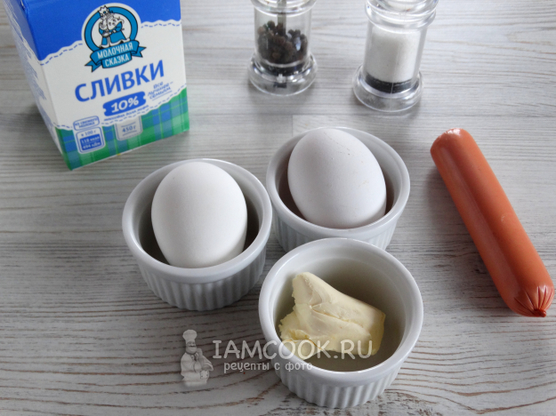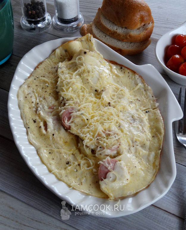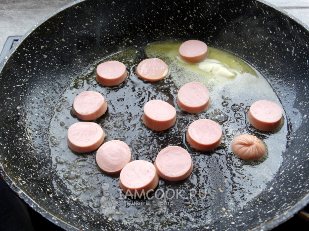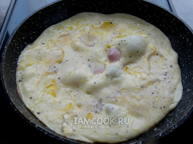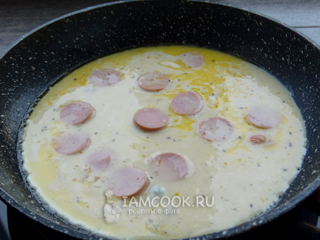 Я сделала омлет с сосиской и немного посыпала сыром, а вообще, можно добавить всё, что есть в наличии в холодильнике)).