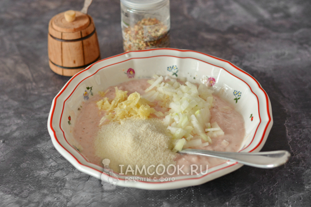 Добавьте к массе нарезанный мелко лук, спрессованный чеснок и семолину.