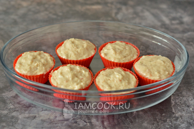 Разложите массу по формочкам для маффинов, формочки установите в глубокую форму и налейте воду слоем 1 см. Таким образом, маффины будут не просто запекаться, а готовиться на водяной бане в духовке.