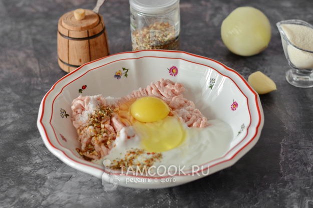 К куриному фаршу добавьте яйцо и йогурт. Всыпьте соль, овощную приправу. Всё тщательно размешайте.