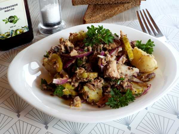 В салате хорошо сочетаются мягкая картошка, хрустящие кисло-сладкие огурчики, капуста и лук. Если салат настоится пару часов - будет еще вкуснее. Приятного аппетита!