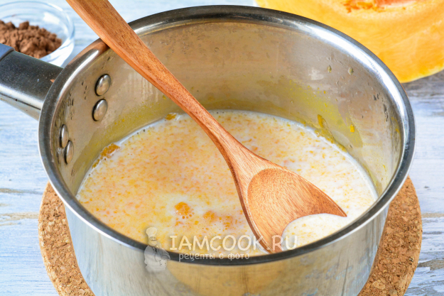Смесь какао влейте в горячее молоко с тыквенным пюре, размешайте. Когда какао закипит, варите его на медленном огне 2-3 минуты. Напиток готов.